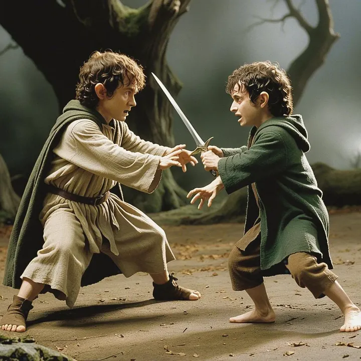 В одному маленькому світі живе народ дуже симпатичних істот… ну, нехай навіть істот-карликів… ну щоб вони взагалі були для читача… такі няшки… милі істоти карлики… І ось у цей світ із світу злих орків, ельфів і всілякої іншої нечисті проникає злобний і страшний калдун і повелитель Саурон. І от, няшки-карлики узнають, що для того, аби визволитися від Саурона, який, падло таке, з’їдає усіх їхніх немовляток, які ну взагалі такі милі, що прямо вмерти можна… ой… вибач, Свєта… такі милі, що прямо впісятися можна… тож, щоб вигнати Саурона, треба у тому іншому Світі Нечисті і Вічних Воєн знайти кольцо і непремінно зберегти його і ні в якому разі не дати його знищити, бо якщо з тим кольцом щось погане станеться, то Саурона тоді вопше з рідного світу уже маковими калачами не виманиш, тобто капець вже повний… А знищити те кольцо хотять злі малоросліки на чолі з підлим Фродом, ельфом, гномом і Сірим Волшебником. А ціль усієї цієї сказочної сволоти прямо притилежна — вони бажають, щоб Саурон навічно лишився у світі наших героїв-карликів і тероризував там їхнє мирне населення. І посилають вони відважного Голума, шпіонська кличка Смеагол у нелегку путь на той світ… знову вибач, Свєта… щоб врятувати дорогоцінне тепер для свого народу кольцо. І він там, короче устраює погоні, войни, дворцові перевороти, революції, зазнає поранень, втрачає частини тіла, тобто почти як Джеймс Бонд…